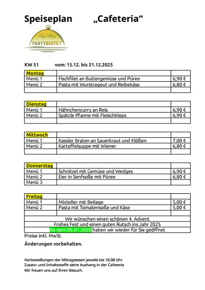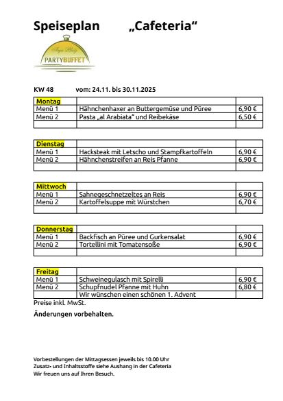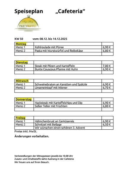 Unsere Speisepläne zum Download Telefonnummer Cafeteria in Mittweida im Haus MWE GmbH: 03727 97 62 36 KW 48 KW 49 KW 50 KW 51